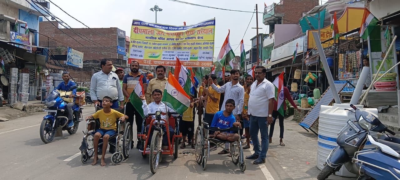 Kaushambi News- दीपमाला जन कल्याण सेवा संस्थान पेरई तिल्हापुर मोड व्यापार मंडल के नेतृत्व में मानसिक मंदित दिव्यांग बच्चों द्वारा गुरुवार को तिरंगा यात्रा रैली निकाली गई है दिव्यांग साइकिल में सवार मानसिक मंदित दिव्यांग बच्चों द्वारा हाथ में झंडा लेकर के भारत माता का जयकारा लगाते हुए तिल्हापुर मोड़ और उसके आसपास भ्रमण कर आजादी के जश्न को मनाया और देश आजादी के बारे में लोगों को बताया उत्साह और उमंग के साथ तिरंगा यात्रा रैली में शामिल लोगों ने भारत माता का जयकारा लगाते हुए इलाके में कई किलोमीटर दूर तक भ्रमण किया है तिरंगा यात्रा रैली कार्यक्रम में सुभाष चन्द्र केसरवानी, मदन कुमार केशरवानी, ऋषभ सिंह, मनीष कुमार, बांके लाल यादव, दीपमाला जन कल्याण सेवा संस्थान के पूर्व अध्यक्ष दीपक सिंह अजीत तिवारी, नेहा पाल, साक्षी सोनकर, रितु मिश्रा,रामेश कुमार सहित तमाम लोग शामिल रहे हैं|